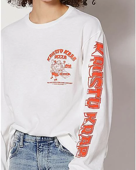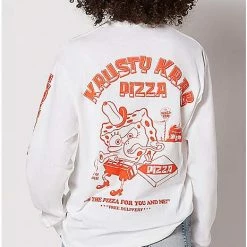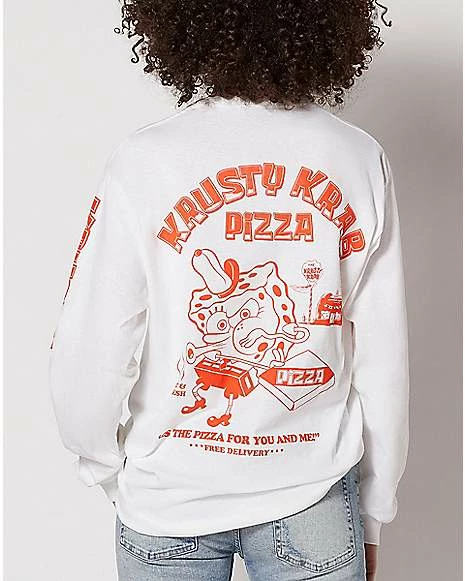 The Krusty Krab Pizza is the pizza for you and me! This officially licensed Krusty Krab Pizza T Shirt has long sleeves and will let everyone know that you are the biggest SpongeBob fan in the room!