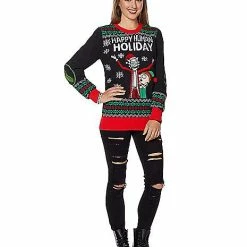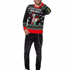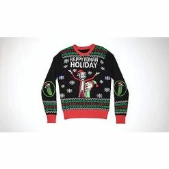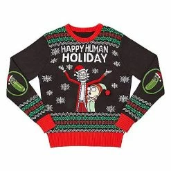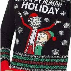 Happy Human Holiday from your favorite cartoon characters, Rick and Morty! This outrageous officially licensed sweater is the perfect way to celebrate and show off your love for Rick and Morty! The light-up snowflake detail will have you shining all night long.
